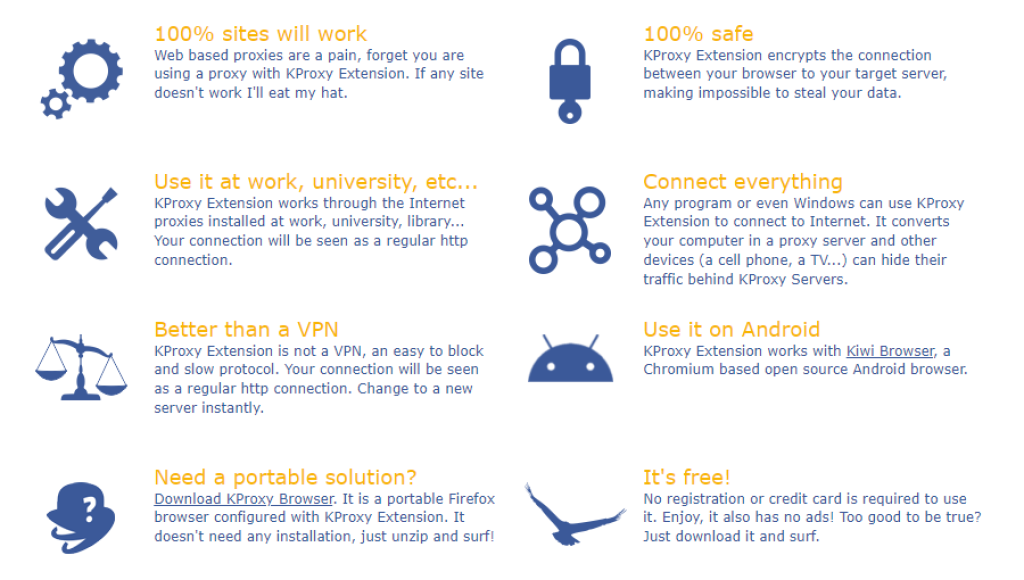 Instead এর explaining the ধরন এর প্রক্সি এটি সরবরাহ করে, KProxy focuses এ the products এটি অফার করে, which হলো the browser extensions, the portable solution, এবং the KProxy Pro.