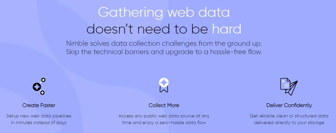 Nimbleway fue fundada en 2019 por un equipo de especialistas en IoT en Israel. Es una tienda única para todas las necesidades de recopilación de datos, combinando tres servicios en un paquete. Estos son una API de web scraping llamada Nimble API, un navegador de automatización llamado Nimble browser, y una red de proxies llamada Nimble IP.