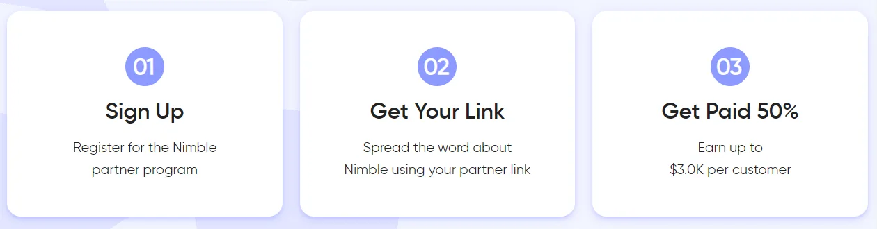 Oui, Nimbleway vous permet de devenir leur partenaire et de gagner en recommandant de nouveaux utilisateurs à la plateforme. Le programme partenaire Nimble est prêt à vous payer une part des revenus de 50 % jusqu'à 2 000 $ par recommandation. Vous pouvez recommander autant d'utilisateurs que vous le souhaitez et gagner d'eux tant qu'ils sont actifs sur la plateforme.