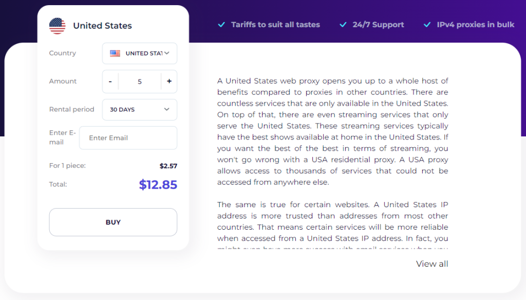 Comprar un proxy desde el sitio web es un proceso bastante fácil. Todo lo que necesitas hacer es navegar al catálogo de proxies, donde verás una lista de los paquetes disponibles. Desde allí, todo lo que tienes que hacer es proporcionar tu dirección de correo electrónico, período de alquiler y el número de proxies que deseas comprar.