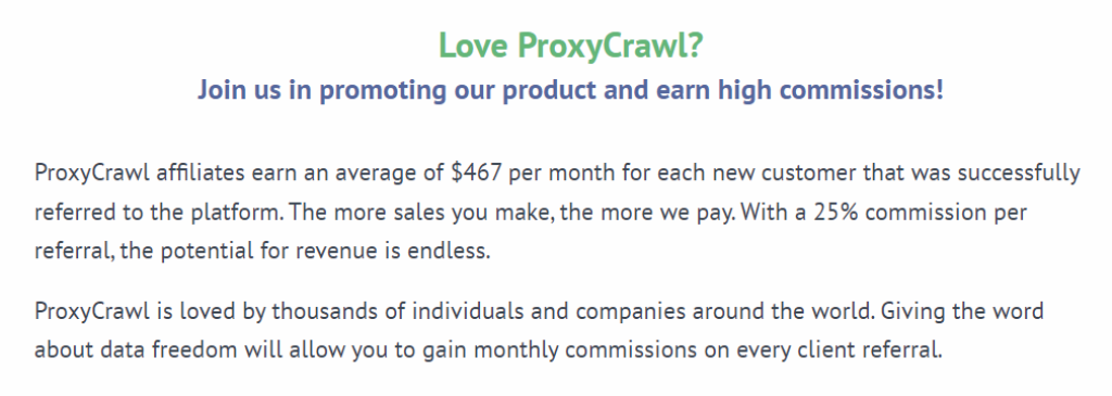 ProxyCrawl dispose d'un excellent programme d'affiliation où vous gagnez de l'argent en recommandant le service à d'autres clients. L'entreprise prétend offrir en moyenne 467 $ pour chaque nouveau client que les affiliés amènent à l'entreprise, ce qui est assez impressionnant.