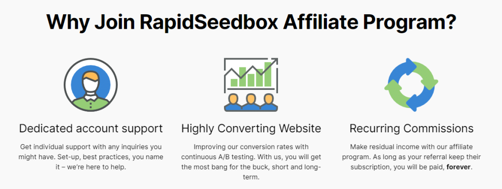 Puede ganar dinero con RapidSeedbox a través del programa de afiliados. Todo lo que tiene que hacer es registrarse para el servicio, después de lo cual el sistema le asignará un enlace único para usar para referencias. RapidSeedbox ofrece una comisión del 10% en todas las ventas de referencia, que es un poco en el lado más bajo ya que otros competidores ofrecen hasta un 25% de comisión.