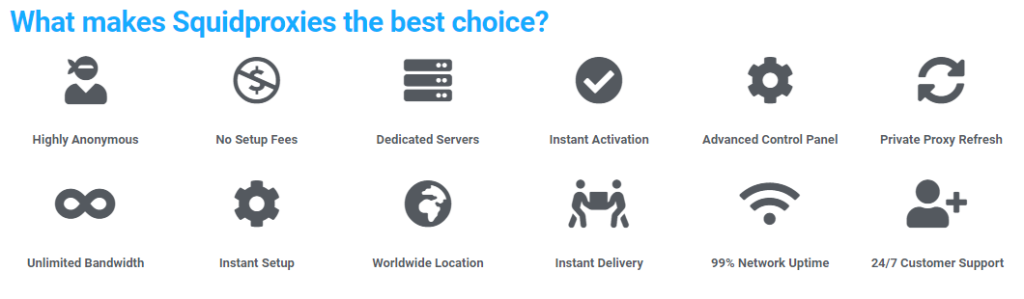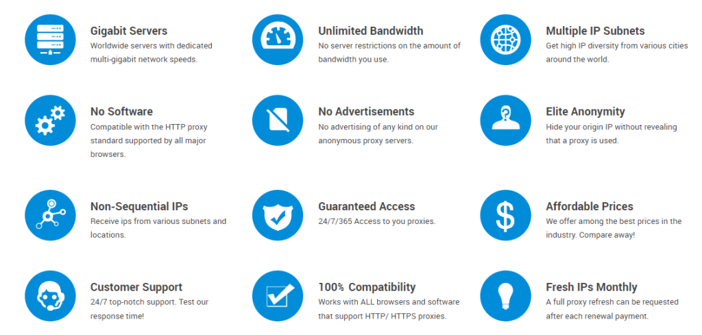Die privaten Proxys von SquidProxies haben viel bessere Funktionen als gemeinsame Proxys. Zum Beispiel sind diese Proxys mit nicht-sequenziellen IPs ausgestattet, war bedeutet, dass Websites weniger wahrscheinlich erkennen, dass Sie Proxys verwenden.