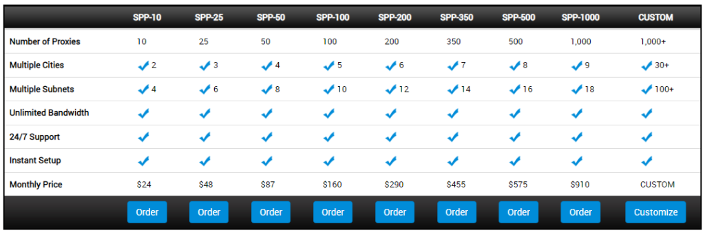 Die Anzahl der Proxys, Städte und Subnetze nimmt zu, wenn Sie Ihren Plan upgraden. Zum Beispiel erhalten Sie mit SPP-200, dem mittleren Plan, 200 Proxys, sechs Städte und 12 Subnetze für 290 $. Schließlich erhalten Sie mit dem teuersten Plan, SPP-2000, 2.000 Proxys, zehn Städte und 20 Subnetze für 1.500 $.