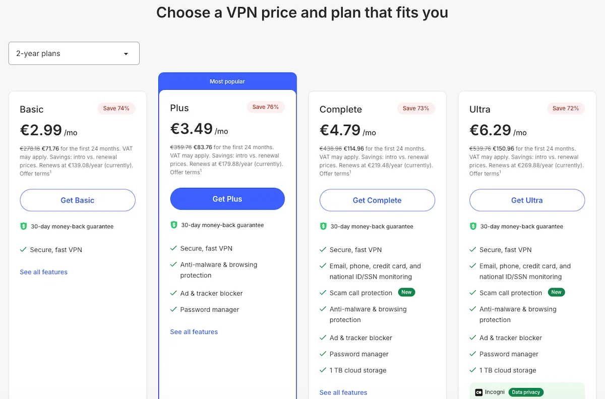 | Ultra | €6.29/mo | Complete + Incogni data removal | 72% |