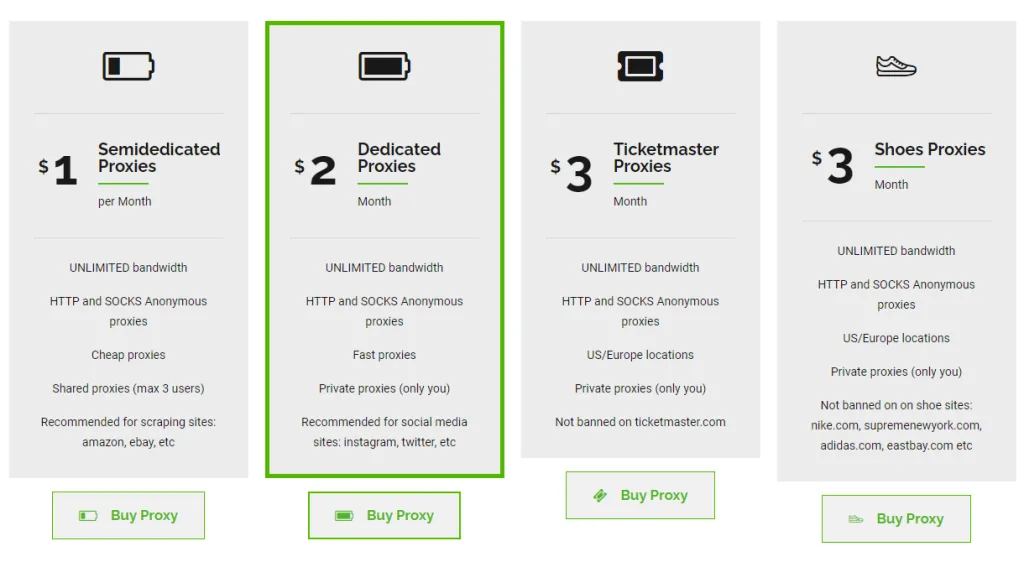 Die verfügbaren Proxys von BuyProxies fallen in vier verschiedene Kategorien: Semi-Dedicated-Proxys, Dedicated-Proxys, Ticketmaster-Proxys und Schuh-Proxys. Sie sollten beachten, dass diese Proxys in verschiedene Preispläne fallen, wie wir später in diesem Beitrag sehen werden.