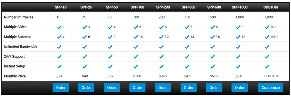 Die Anzahl der Proxys, Städte und Subnetze nimmt zu, wenn Sie Ihren Plan upgraden. Zum Beispiel erhalten Sie mit SPP-200, dem mittleren Plan, 200 Proxys, sechs Städte und 12 Subnetze für 290 $. Schließlich erhalten Sie mit dem teuersten Plan, SPP-2000, 2.000 Proxys, zehn Städte und 20 Subnetze für 1.500 $.
