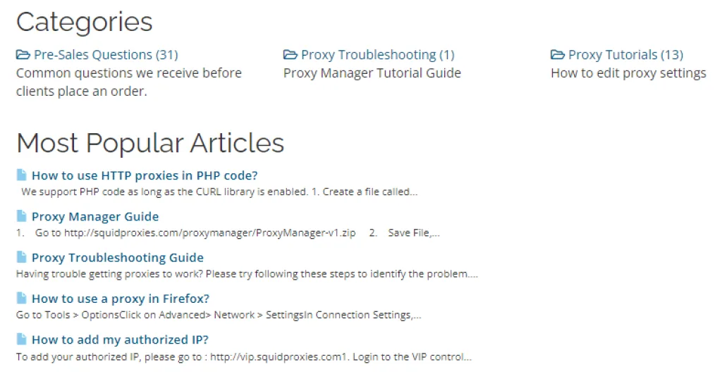 Der Kundenservice von SquidProxies könnte verbessert werden. Obwohl die Webseite Tutorials enthält, sind diese grundlegend und kurz mit minimalem Aufmerksamkeit für Details. Benutzer haben möglicherweise immer noch Probleme, auch nachdem sie dieses Material durchgegangen sind.