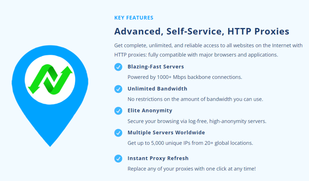 El pool de red de proxies de esta empresa consta de más de 399,000 IPs, que es un número decente de proxies de centro de datos que te mantendrá anónimo en línea. A diferencia de la mayoría de sus competidores, NewIPNow muestra el número de IPs únicas en su página de inicio, que es 5,000.