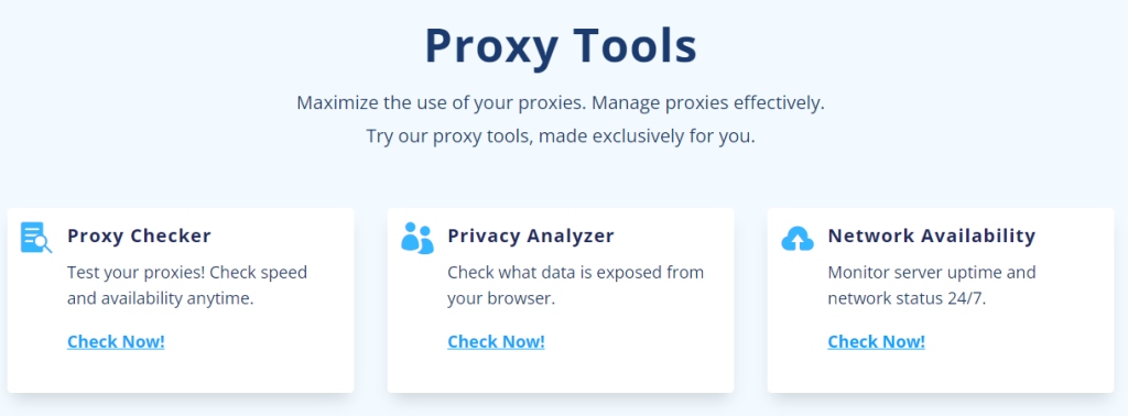 Incluyen un verificador de proxies para probar la velocidad y disponibilidad de tus proxies, un analizador de privacidad que te ayudará a encontrar qué datos están expuestos desde tu navegador, y un sistema de monitoreo que muestra el tiempo de actividad y inactividad de proxies las 24/7. Desafortunadamente, la empresa no tiene API, al menos por ahora.