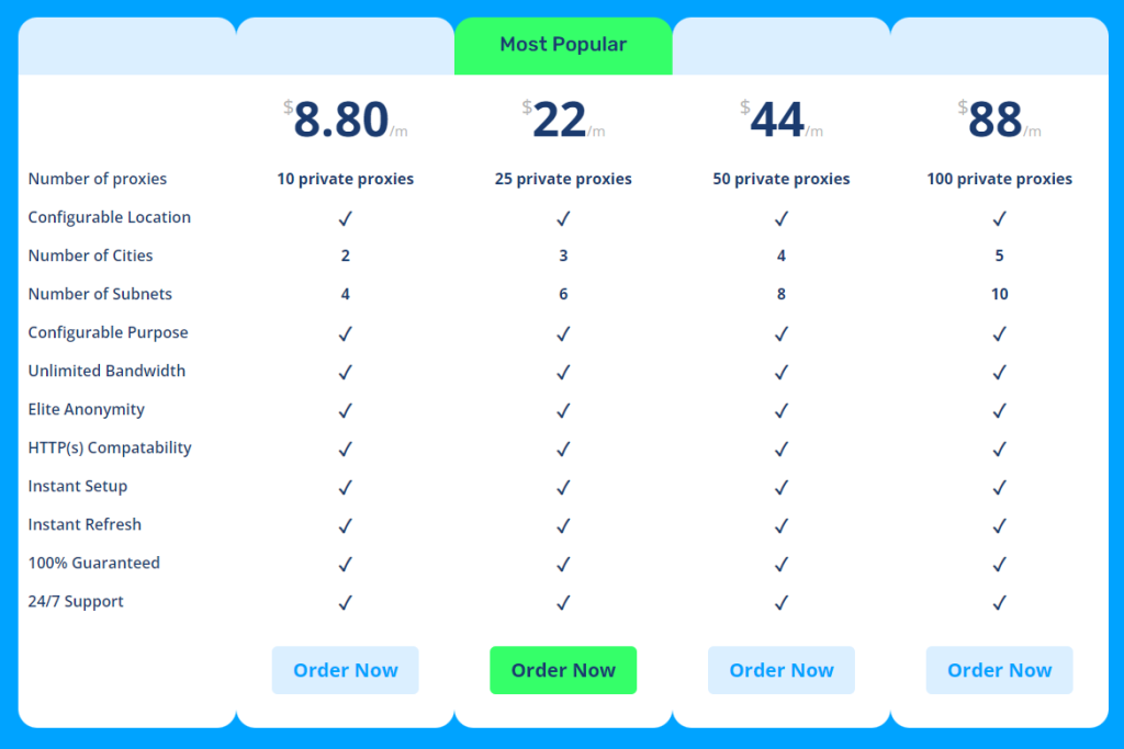Por ejemplo, 10 proxies privados cuestan $8.80 al mes, lo que significa pagar solo $0.88 por proxy privado. El precio por proxy no cambia sin importar cuántos proxies ordenes y para qué propósito. Esto es único para NewIPNow porque la mayoría de proveedores tienden a dar precios más bajos para órdenes más grandes.