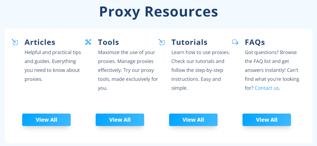 El sitio proporciona buenos recursos de proxies para ayudarte a entender y usar los proxies fácilmente. Hay artículos informativos que te ayudarán a aprender las cosas más importantes sobre proxies, herramientas que te ayudarán a gestionar tus proxies de manera efectiva, tutoriales con instrucciones paso a paso sobre cómo usar los proxies, y una página de preguntas frecuentes con algunas de las preguntas más comunes sobre el servicio de NewIPNow.