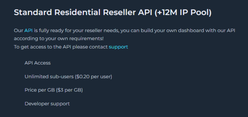 SpeedProxies ofrece una API de revendedor, lo que significa que soporta la reventa de sus servicios de proxy. Según el sitio web, cualquiera interesado en revender proxies residenciales puede ponerse en contacto con el equipo de soporte para acceder al panel de API. Una ventaja significativa de esta herramienta es que puede crear su panel según sus requisitos.