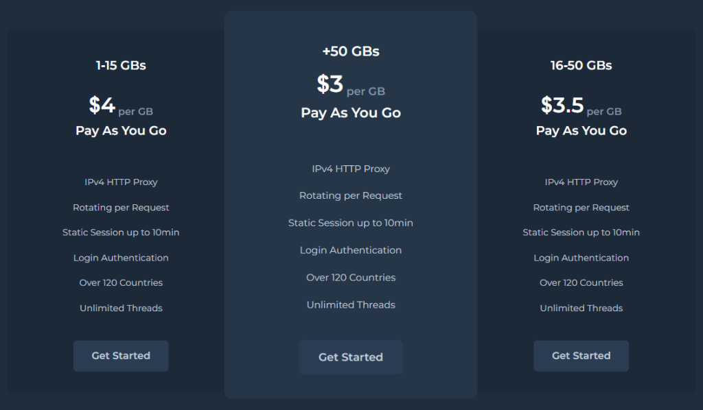En los proxies de datacenter, se le cobra según el número de proxies que compre. Lo mismo ocurre con los proxies móviles e ISP. Para los proxies residenciales, los precios comienzan en $3 por GB, que no es tan caro y tampoco es tan barato.