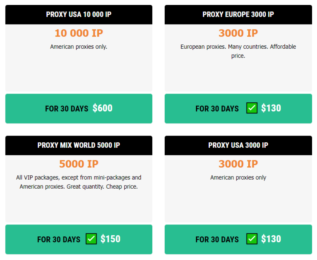 このプロバイダーは明確に、そのサービスに対する割引を持っていることを明記していません。ただし、わずかな価格に加えて、一括注文をしたときはさらに安くなります。たとえば、共有プロキシを取得します。100プロキシがヨーロッパなどの地域で60ドルで利用できるときに、3,000プロキシは130ドルで利用でき、20ドルの割引です。この重大な割引は、多くのプロキシを探しているほとんどのユーザーで機能します。