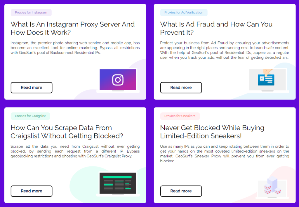 The most common mga use case of GeoSurf proxies are ad verification, web scraping, social media automation, sales intelligence, sneaker copping, SEO, etc.