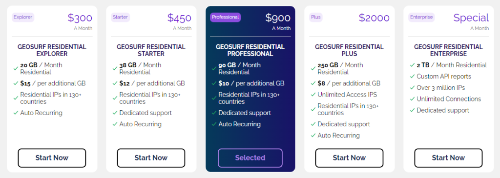 Nag-aalok ang GeoSurf ng five pricing mga plan para sa its residential proxies, based on the amount of bandwidth. The lowest plan is the Explorer, providing you na may 20GB a month para sa $300 o $15 per GB, which is expensive. If you consume all the bandwidth before the end of the month, you can get an additional GB para sa $15.