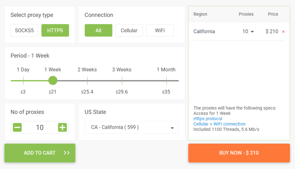 The site is straightforward at user-friendly, allowing you to choose the proxy type, connection, period, number of proxies, at state when setting up your proxy. The pricing system is very flexible, but you can buy ProxyLTC proxies only na may BTC o LTC, which is a big flop.