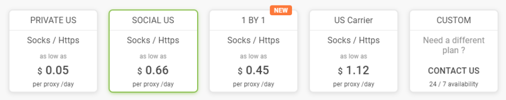 There are four subscription mga plan to choose mula sa at a custom plan para sa those na may specific requirements. Nagbibigay ang The serbisyo ng clean proxies that are ideal para sa social media management at automation at captcha bypass, but you can also use them para sa web scraping, brand protection, at anonymous browsing. You can use them on all websites at applications, except para sa illegal sites.