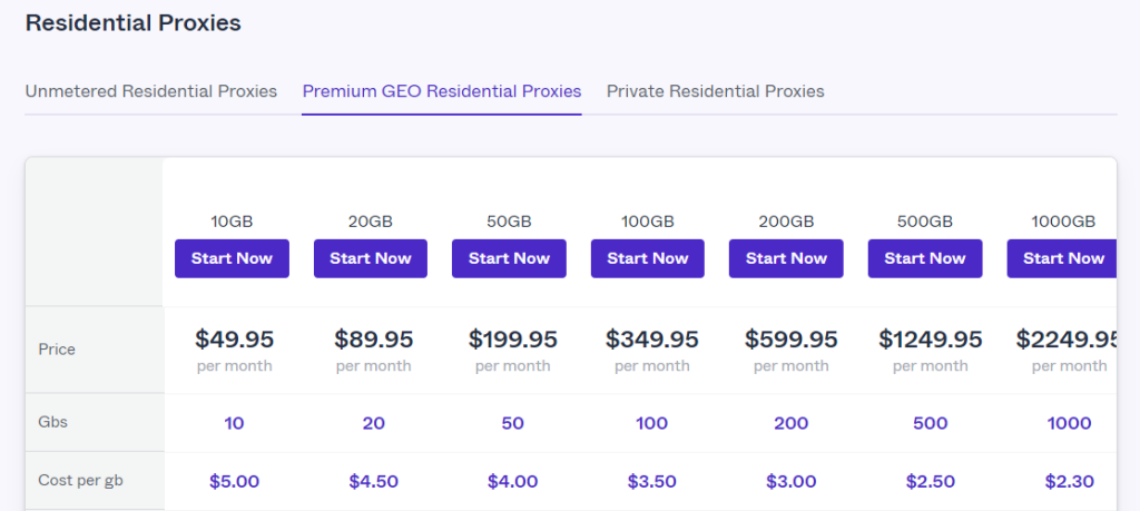 Der Anbieter bietet drei Residential-Produkte an. Das erste ist private unbegrenzte Residential-Proxys, die ideal sind, wenn Sie unbegrenzte Daten benötigen, die Fähigkeit zum Arbeiten auf streng sicheren Websites und schnellere Fertigstellung.