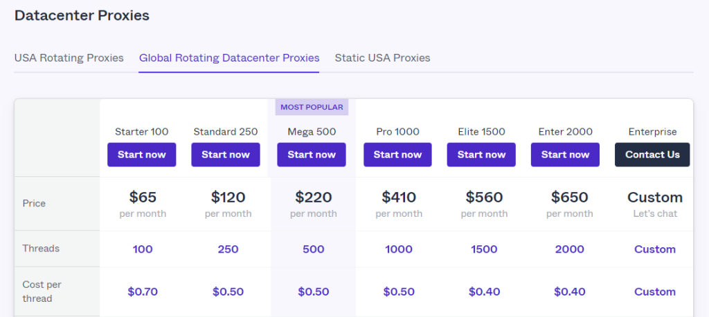 最後のオプションは、静的なIPアドレス、信頼性、速度を提供する静的USAデータセンタープロキシです。ローテーションするが静的プロキシを必要としない場合、これはサービスを選択する必要があります。ただし、共有プロキシです。つまり、3〜5人の他のユーザーと共有します。だから、それはフロップです。