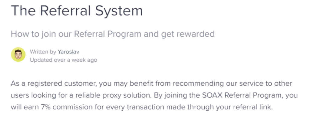 Vous pouvez gagner de l'argent avec SOAX via le programme d'affiliation. La page de parrainage se trouve sur le tableau de bord, et vous pouvez y accéder une fois que vous vous inscrivez à SOAX, d'où vous accédez à tous les outils dont vous avez besoin pour gagner de l'argent. Cela comprend votre lien d'affiliation unique et des statistiques en temps réel montrant combien vous avez gagné grâce au programme.