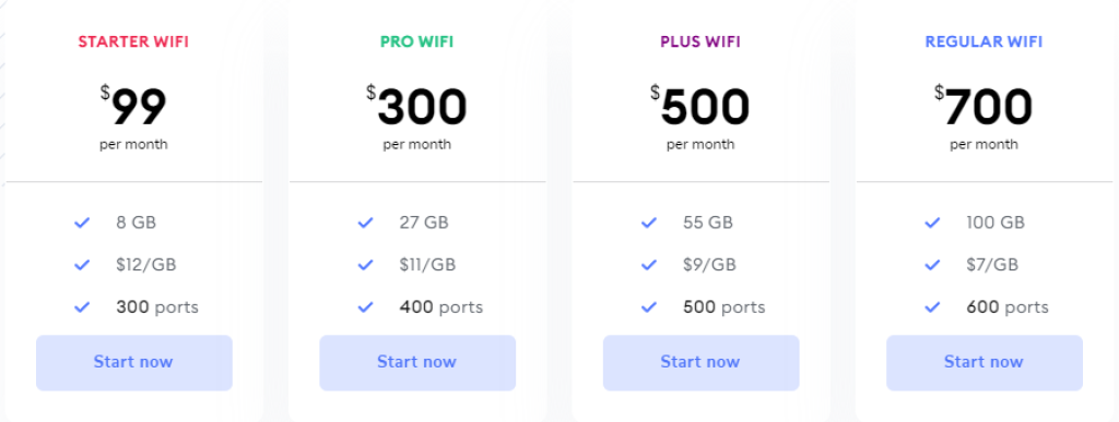 sa maging tapat, maaaring malayo cheaper sa mas maganda mga opsyon sa market. Under ang smallest tier, nakakakuha ka ng 8 GB worth ng datos, 300 ports, sa pwede mo i-whitelist ang two IPs. Ang karamihan mahal ay $700 per month, nag-aalok ng 100 GB ng datos na maaaring 600 ports. Dito pwede mo i-whitelist ang 5 IPs. Ang enterprise mga customer ay pwede ring mag-talk sa suportahan team para sa customized packages.