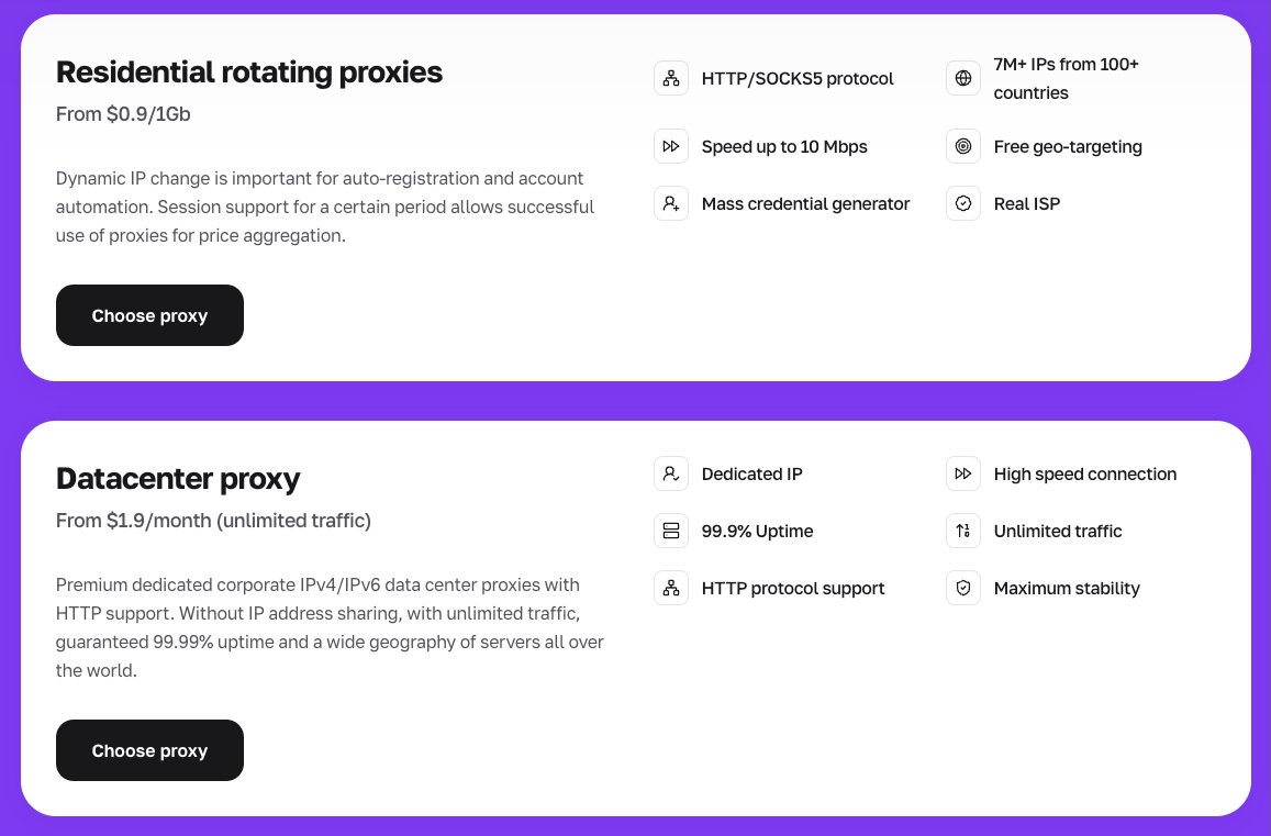 आवासीय रोटेटिंग प्रॉक्सी 50M+ IP के बड़े वैश्विक पूल से गतिशील IP रोटेशन प्रदान करते हैं। वे HTTP और SOCKS5 प्रोटोकॉल का समर्थन करते हैं, 10 Mbps तक की गति प्रदान करते हैं और 100+ देशों में मुफ्त भू-लक्ष्यीकरण शामिल करते हैं। ये खाता ऑटोमेशन, मूल्य निगरानी और बड़े पैमाने पर डेटा संग्रहण के लिए सर्वश्रेष्ठ हैं। मूल्य निर्धारण $0.9/GB से शुरू होता है।