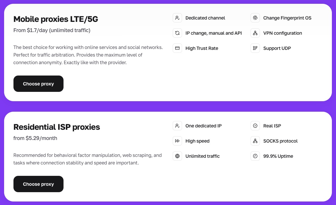 मोबाइल प्रॉक्सी असीमित ट्रैफिक के साथ वास्तविक LTE और 5G कैरियर नेटवर्क के माध्यम से संचालित होते हैं। वे सोशल नेटवर्क, विज्ञापन प्लेटफॉर्म, टिकटिंग और खाता-आधारित वर्कफ़्लो जैसे विश्वास-संवेदनशील प्लेटफॉर्म के लिए आदर्श हैं। मुख्य विशेषताओं में समर्पित चैनल, मैनुअल और API-आधारित IP रोटेशन, OS फिंगरप्रिंट स्विचिंग, VPN/VLESS कॉन्फ़िगरेशन और UDP प्रोटोकॉल समर्थन शामिल हैं। मूल्य निर्धारण $1.7/दिन से शुरू होता है।