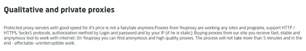 This provider does its job but I would not recommend it to anyone. There are plenty of better providers to chose from. Pricing for its features is really overpriced because their proxies dont work properly 24/7 and they are slow most of the time. I ordered SOCKS5 proxies and I can say this without any regrets that other providers have a lot better proxies.