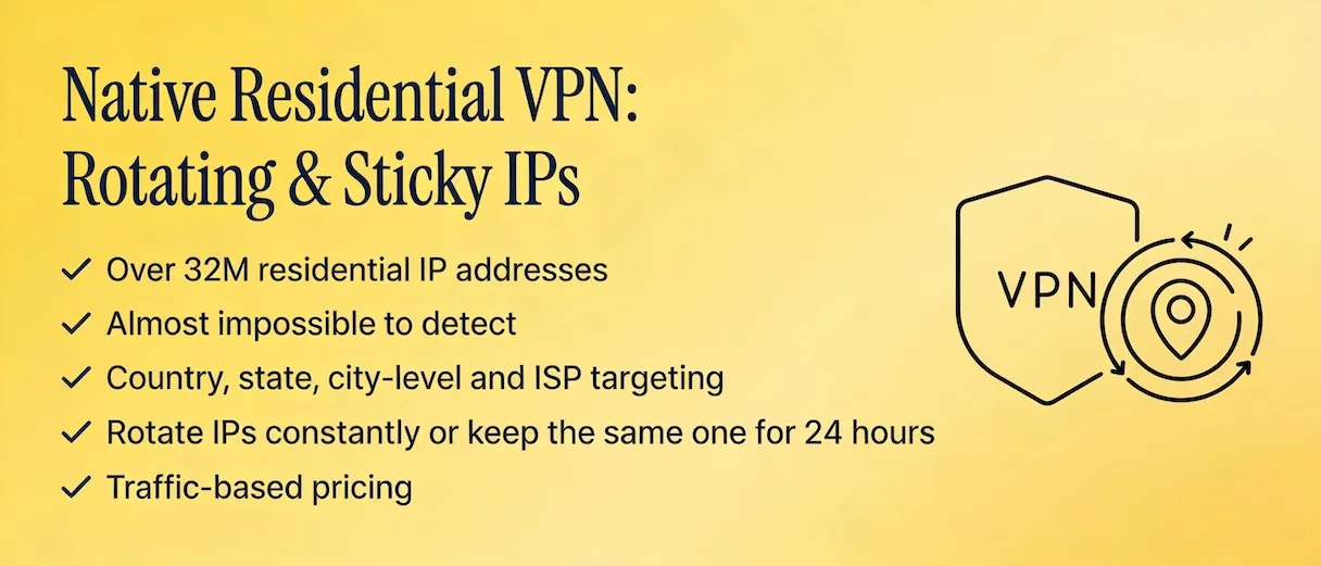 Se questo suona come te, i proxy residenziali rotanti potrebbero essere eccessivi. Invece, la scelta più intelligente e facile è una VPN Residenziale Nativa.