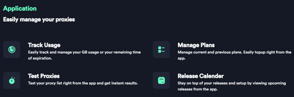 Ad esempio, puoi usare l'applicazione per tracciare quanta larghezza di banda hai consumato mentre usi i proxy per diversi compiti. Inoltre, puoi usarlo per gestire il tuo abbonamento, upgradare o downgrade. Infine, l'app ti consente di testare i proxy e ottenere risultati istantanei.