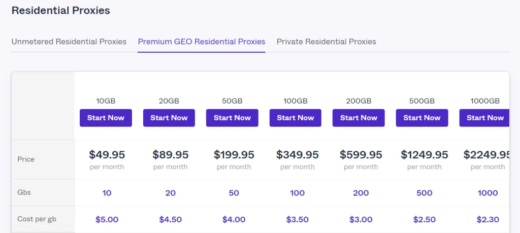 Il provider offre tre prodotti residenziali. Il primo è proxy residenziali illimitati privati che sono ideali se hai bisogno di dati senza limiti, la capacità di completare il lavoro su siti super sicuri e un completamento più veloce.
