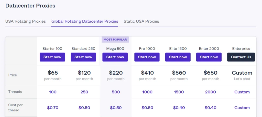 L'ultima opzione è proxy datacenter statici USA che ti forniscono indirizzi IP statici, affidabilità e velocità. Quindi, se non hai bisogno di proxy rotanti ma statici, questo è il servizio da scegliere. Tuttavia, sono proxy condivisi, il che significa che li condividi con tre o cinque altri utenti, quindi è uno svantaggio.