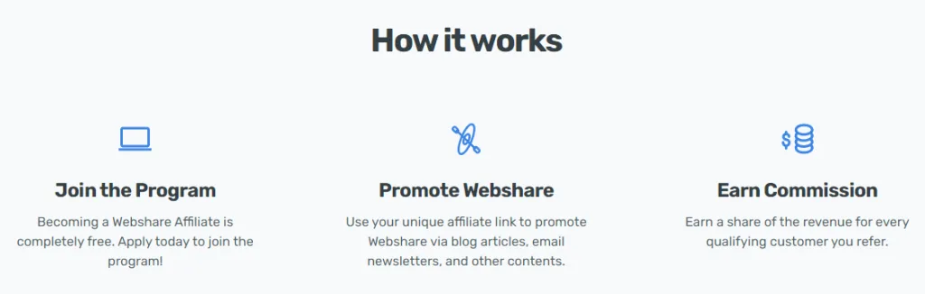 Oltre al programma di riferimento clienti, Webshare ha anche un programma di affiliazione per i professionisti del marketing digitale. Puoi promuovere l'azienda tramite il tuo blog o sito web e guadagnare fino al 25% per ogni $ 100 che un utente di riferimento spende. Tutto quello che devi fare è fornire il tuo indirizzo e-mail di PayPal e i dettagli quando ti iscrivi al servizio.