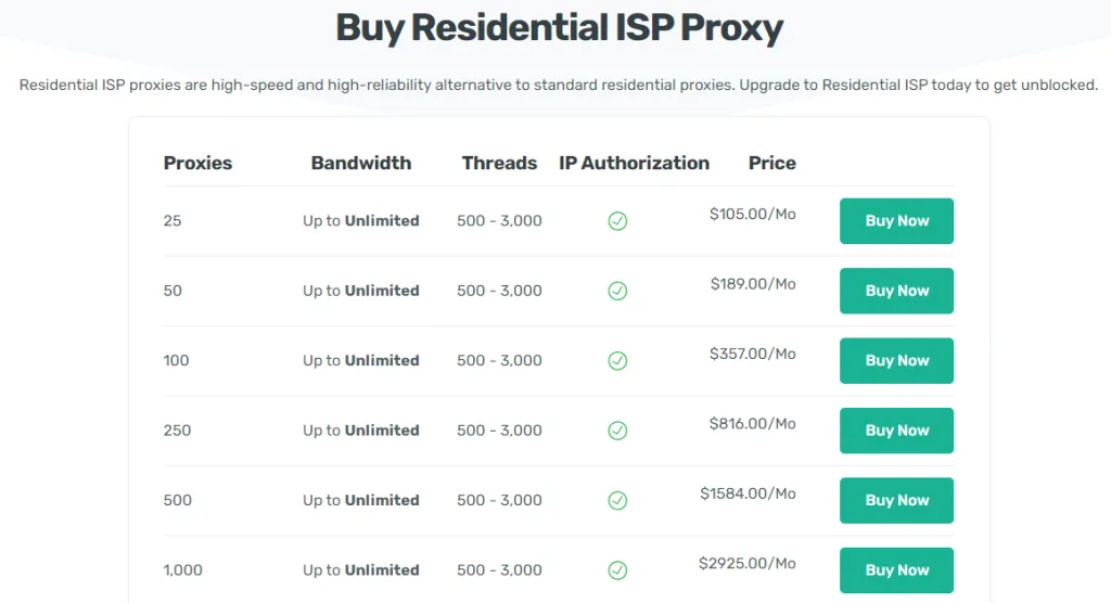 Il piano più costoso è i 'Proxy dedicati', che inizia a $ 39,90 al mese. Ottieni le stesse opzioni del piano 'Proxy privati' con proxy datacenter premium e standard e proxy ISP residenziali. Ancora una volta, i proxy datacenter sono i più convenienti.