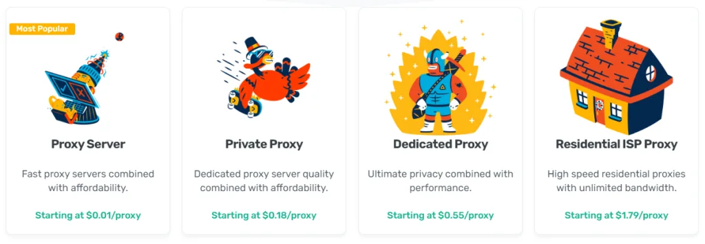 Ogni tipo di proxy ha un prezzo diverso e ha opzioni diverse. I pacchetti di questa azienda rientrano in queste categorie: 'Server proxy,' 'Proxy privati,' 'Proxy dedicati,' 'Proxy rotanti' e 'Proxy ISP residenziali'.