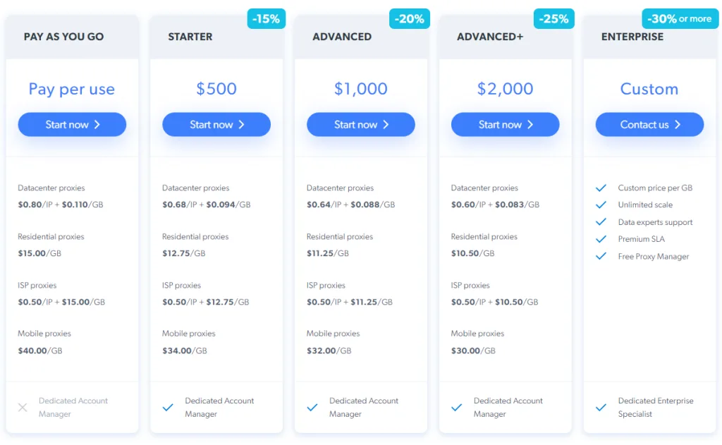 Bright Data biedt zijn klanten vanaf het begin een volledig pakket proxy's met aanbiedingen die minstens net zo goed of beter zijn dan andere proxy aanbieders. Ze verbergen proxy's niet en sluiten ze niet achter servicelagen of abonnementsupgrades, een trend die we onlangs hebben opgemerkt.