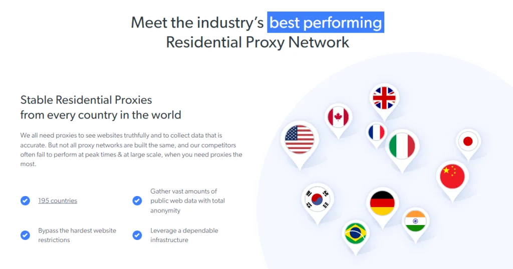 Omdat Bright Data zakelijk gericht is, hebben hun residentiële proxy's meer slagkracht dan het standaardaanbod. Ze bieden meer dan 70 miljoen IP-adressen in 195 landen, allemaal geverifieerd door Bright Data's ethische veiligheids- en privacyscreeningsproces. Deze proxy's hebben een uptime van meer dan 99%, wat betekent dat uw bedrijven geen onhandige downtime of catastrofale fouten zullen ondervinden.
