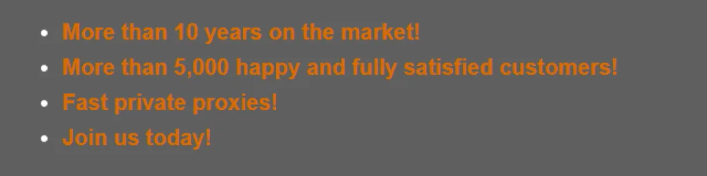 De proxy aanbieder stelt dat zijn proxies geweldig zijn voor webscraping, normaal browsen en SEO scraping software zoals CraigsDominator, XRumer, Scrapebox, Long Tail Pro, WebHarvy, SEnuke, enzovoort.