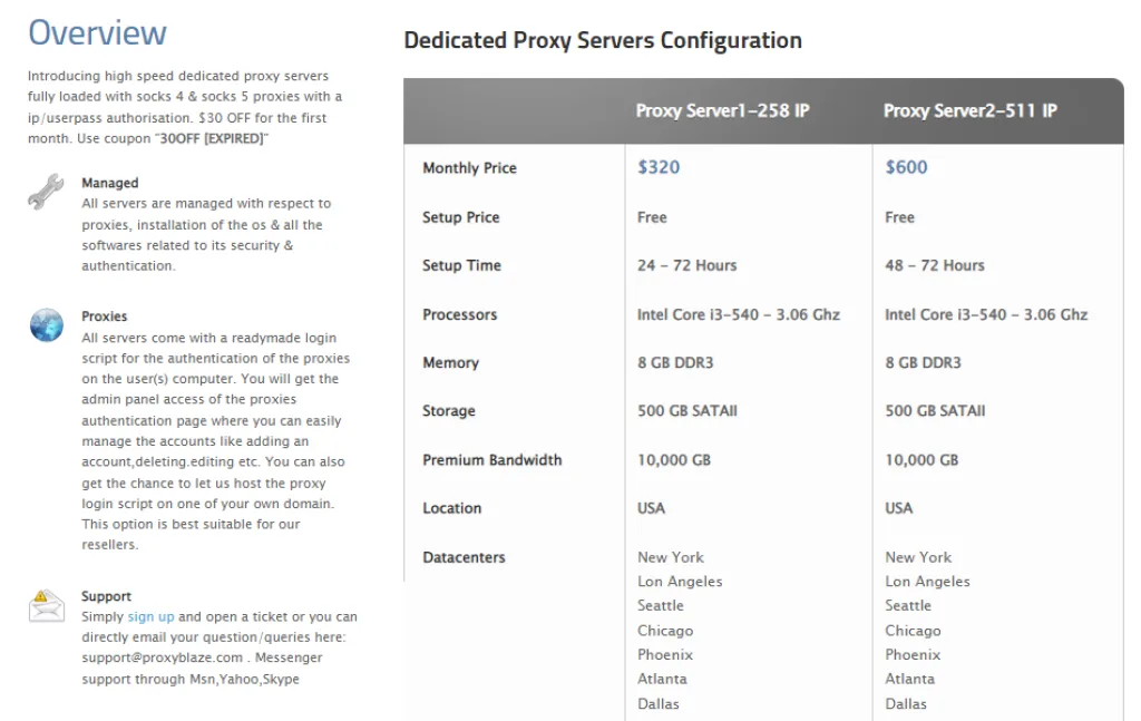 Założona w 2010 roku, ProxyBlaze wydaje się, że przez ponad dekadę dostarcza prywatne serwery proxy USA i dedykowane serwery proxy. Jej serwery proxy wysokiego poziomu anonimowości 1 lub elite są głównie kupowane i używane przez małe i średnie firmy.