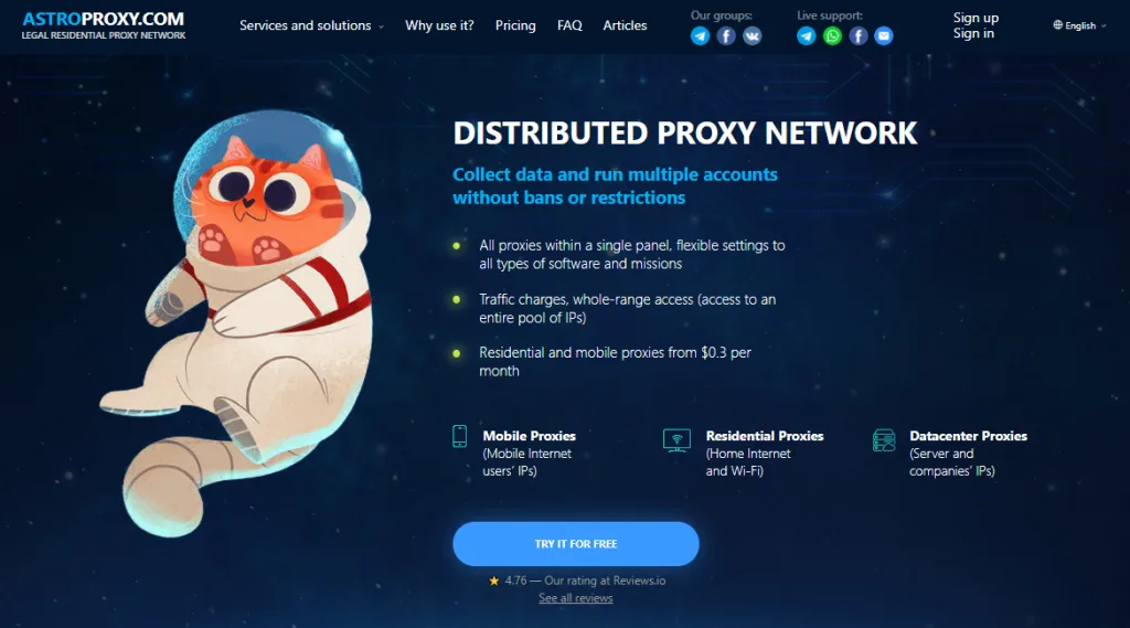 Astroproxy is a great proxy provider if you need cheap residential, datacenter, or mobile proxies for tasks that don’t require fast speeds. It has a good free trial and flexible payment options, so you can create the perfect plan for your proxy needs and budget.