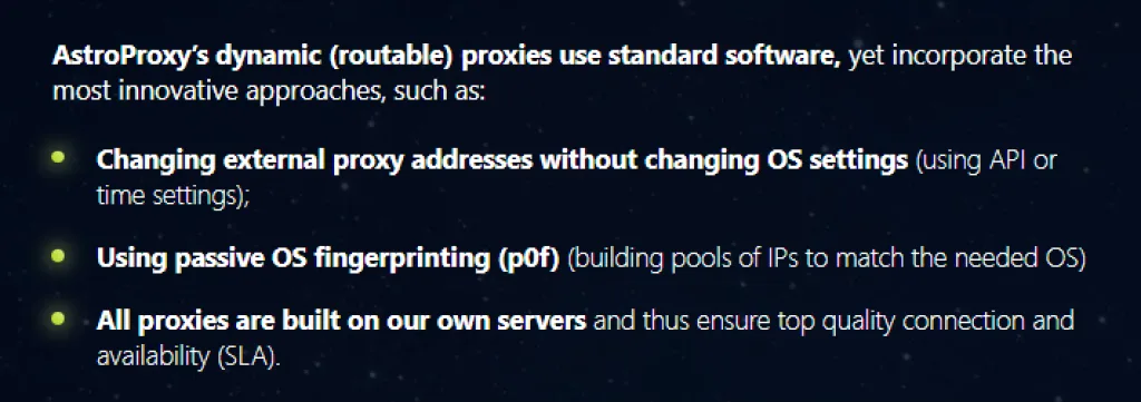 Also, no datacenter IP is shared with multiple users, so you can rest assured you’re the only user of your Astroproxy datacenter IPs. You can use them for tasks that require an average level of anonymity and security.