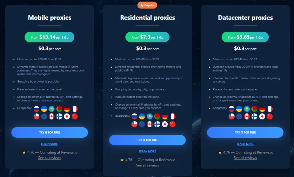 Astroproxy has been selling residential, mobile, and datacenter proxies for over four years. It’s a low-cost proxy provider known for its flexible price options, which is why many proxy users consider it for their proxy needs. Some users say it has the most flexible packages of all companies in the market, but we’ll get into that a bit later.