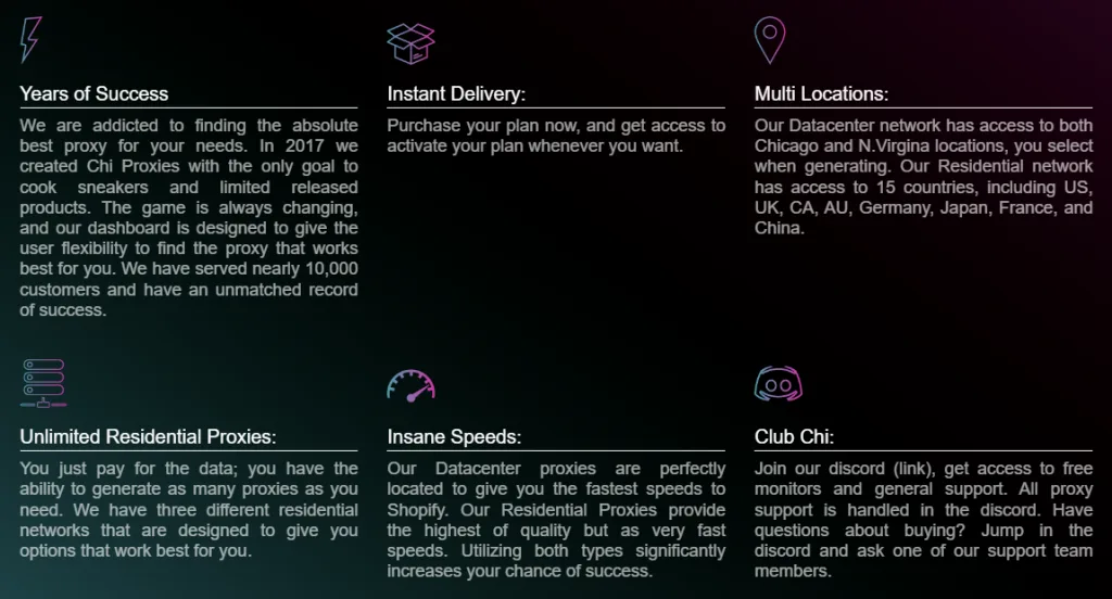 In fact, the website says that the company's primary goal is to provide proxies that can help cop sneakers and limited-release products. As expected, Chi Proxies only deals with one kind of proxy: datacenter proxies. We expected this because datacenter proxies are known to work best for botting tasks such as sneaker copping.