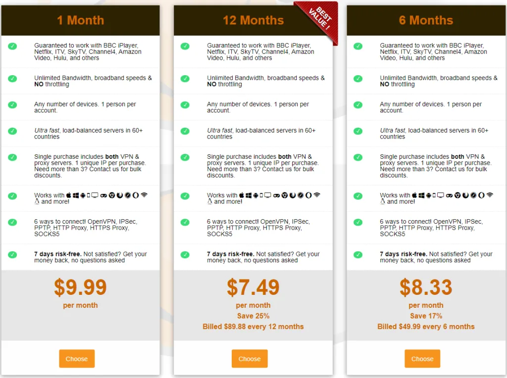 This company offers proxy services bundled up together with a VPN. You should, however, note that you cannot use these two services simultaneously. The American company offers services under three different subscription plans: monthly, bi-annual, and annual.
