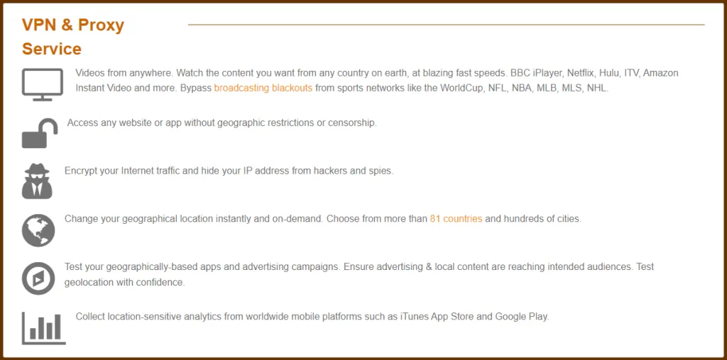Our analysis showed that this provider might not have the features to match up to other top-tier proxy service companies. We drew this conclusion from several observations. For one thing, this provider seems to be quite shady about its service. While it mentions support for 81 locations, we noted other website sections specifying location support in over 110 countries.
