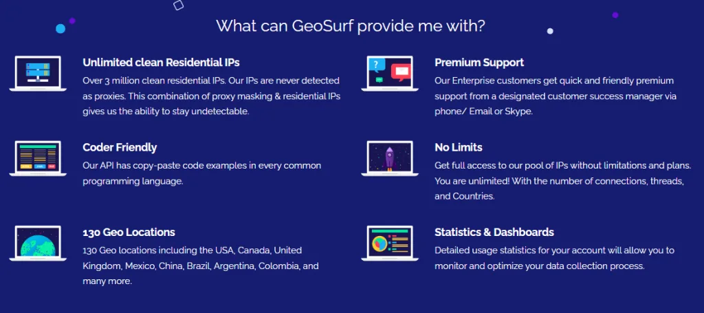 GeoSurf’s proxy pool spans over 3.5 million residential IPs. Although there are other proxy providers with bigger proxy pools, 3.5 million is still a very good number that will help you perform any proxy task you can think of. The high number of IPs gives you peace of mind that you can scrape data without worrying about any limitations.