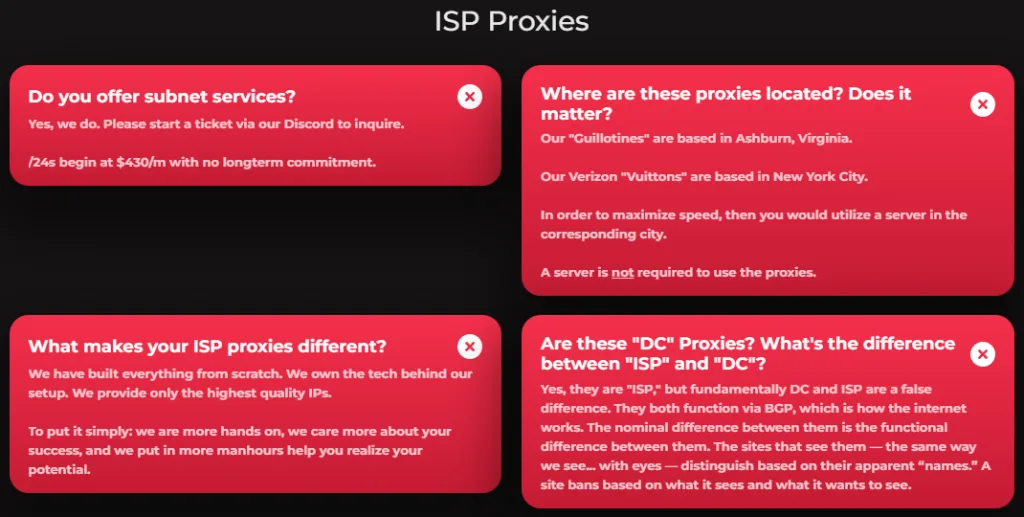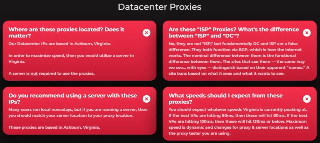Notify Proxies specializes in residential, datacenter, and ISP proxies. Note that there is a stark difference between these proxies. Residential proxies, for example, are connected to internet service providers meaning they are less likely to get discovered.
