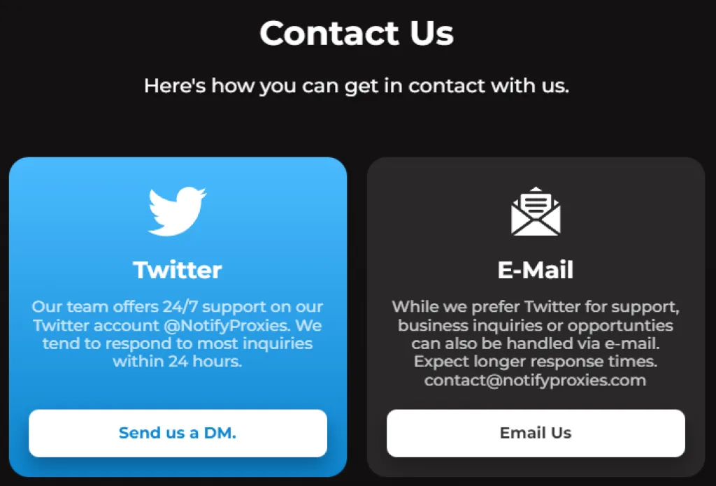You can only reach the customer agents via social media channels such as Twitter or Discord. You can also send them an email. Still, these are insufficient ways of reaching the support team. It would be better for Notify Proxies to introduce a live chat or ticketing feature from the main website.